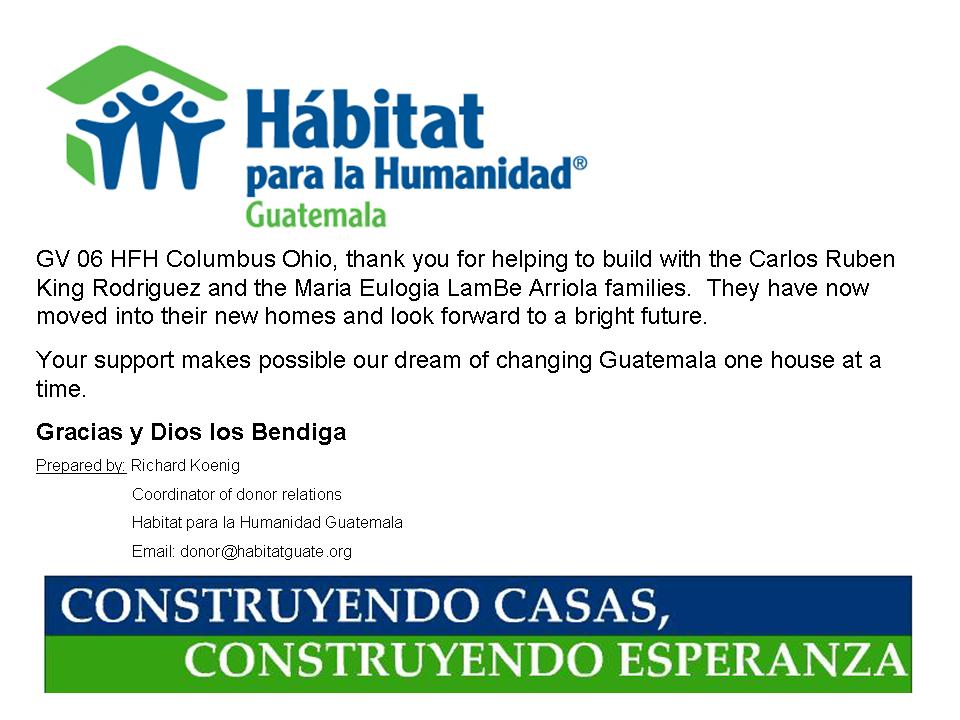 Would you please consider making a donation? Our Columbus GV Team web site is filled with information about the upcoming Botswana projects and results from past missions to Thailand, Dominican Republic, Ghana, Mexico, Guatemala, Bolivia and Ecuador. Please review it and respond generously. Your contribution will be incredibly helpful, whether you support a person for a week ($1,800) or a day ($250) or half of a day ($125) or with any other amount.