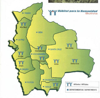 Habitat for Humanity Bolivia (HPHB) has built more than 6,204 houses since its inception in December 2005. Habitat Bolivia currently builds out of 9 Affiliate offices throughout the country: Alto Beni, El Alto, Cochabamba, Chimoré, Santa Cruz, San Julian, Ichilo, Oruro and Tarija.